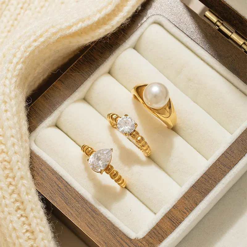 14K Gold Plated Geometric 304 Stainless Steel Vacuum Electroplated Rhinestone Simple Style Classic Ring for Unisex