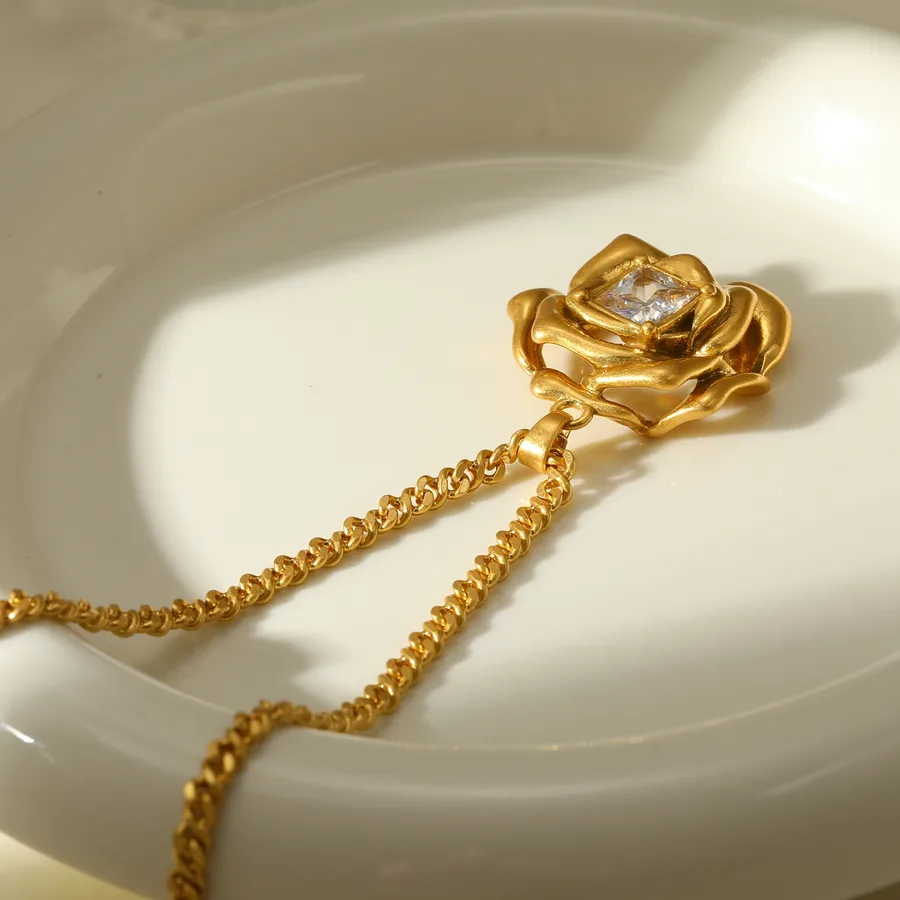 18K Gold Plated Copper Vacuum Electroplating (In Furnace) Zircon Flower Inlaid Cuban Chain/Curb Chain Pendant Necklace for Women