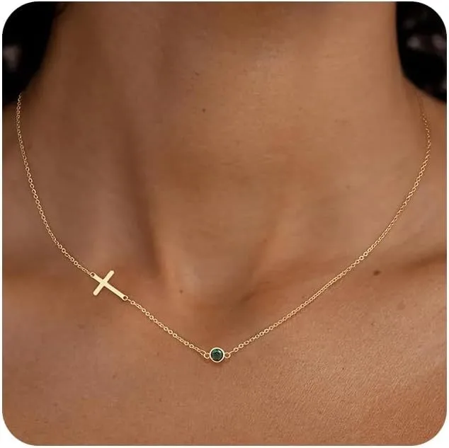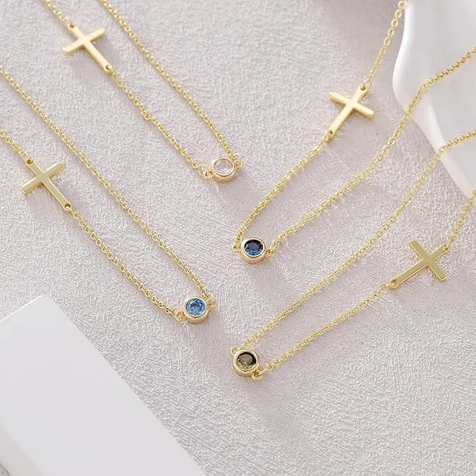 Birthday Girl’s Necklace Small Side Cross With Birthstone Elegant Luxury Style Stainless Steel And Titanium Jewelry Accessory