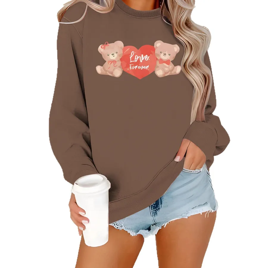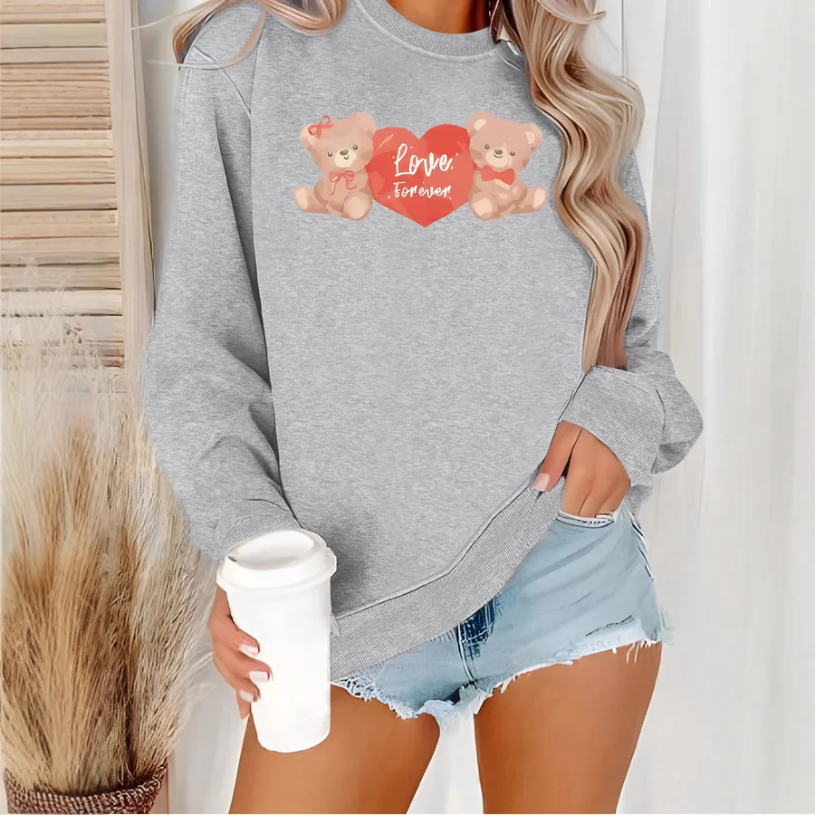Casual Long Sleeve Round Neck Sweatshirt Teddy Bear and Heart Print Women Polyester Top