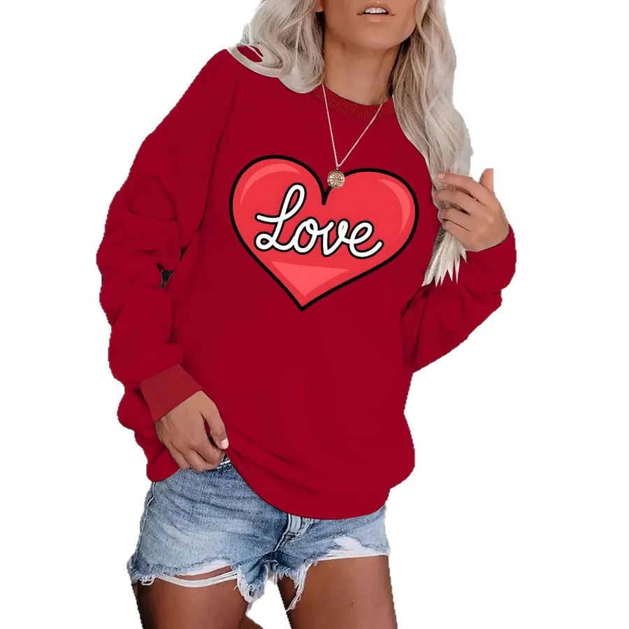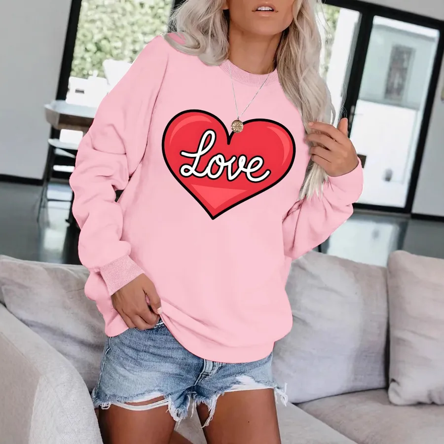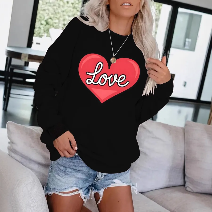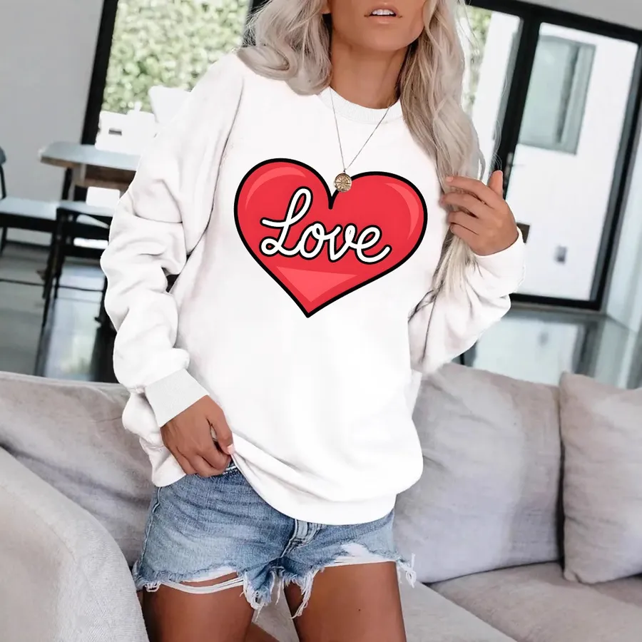 Casual Loose Sweatshirt for Women with Heart Print, Round Neck, Sports Style, Long Sleeve, Street Style, Spring Summer, Polyester Spandex