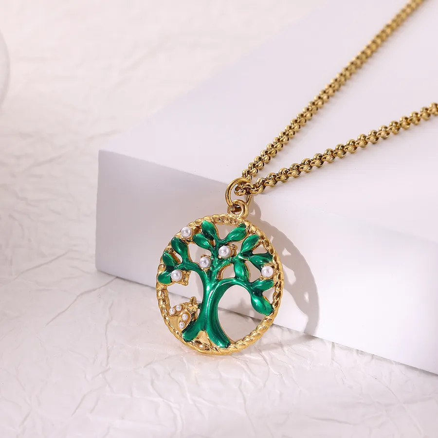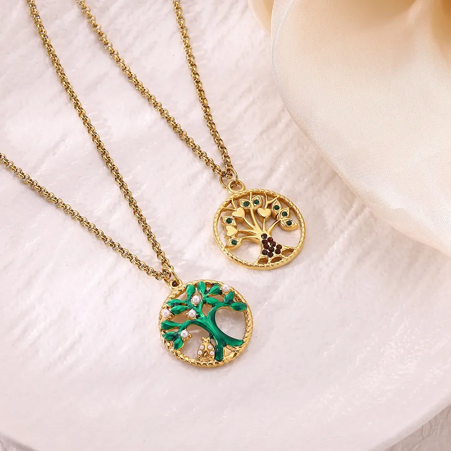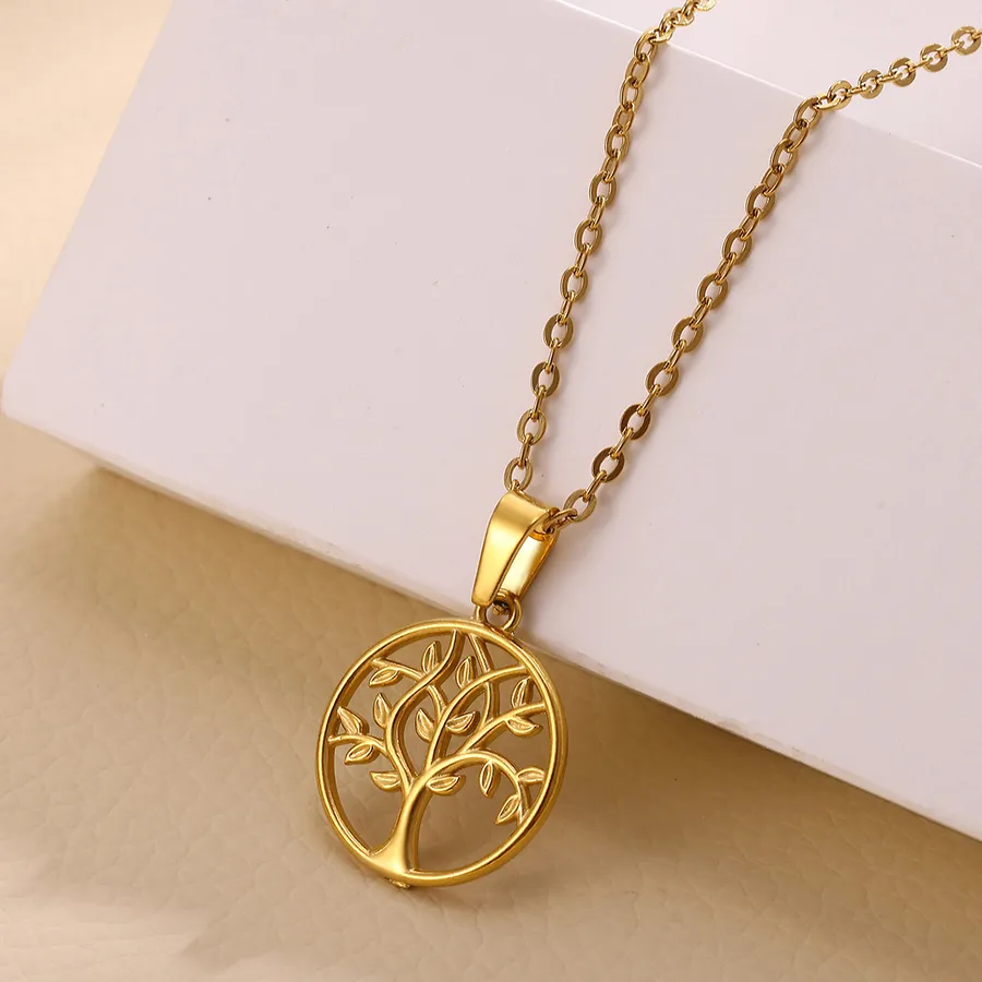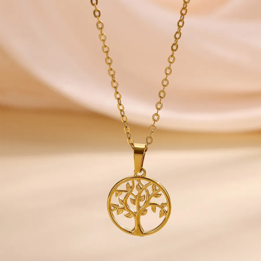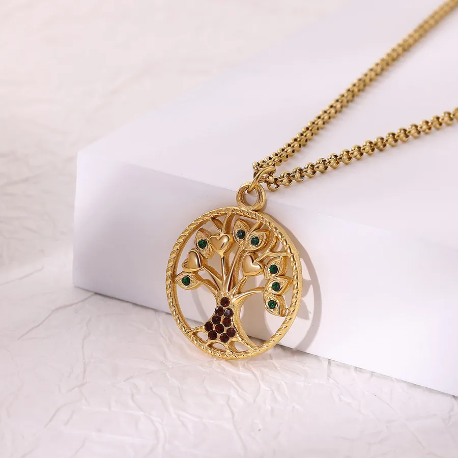 Classic 304 Stainless Steel Tree of Life Sun Circle Tulip Leaf Pendant Necklace 18K Gold Plated Vacuum Electroplated Zircon Cable Chain Waterproof Non-Fading Couple