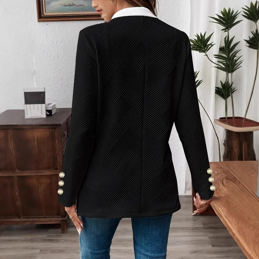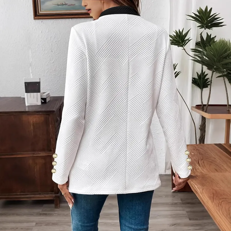 Elegant Black White Spliced Color Pocket Metal Buckle Suit Jacket Style Long Sleeve Commute Fashion Women