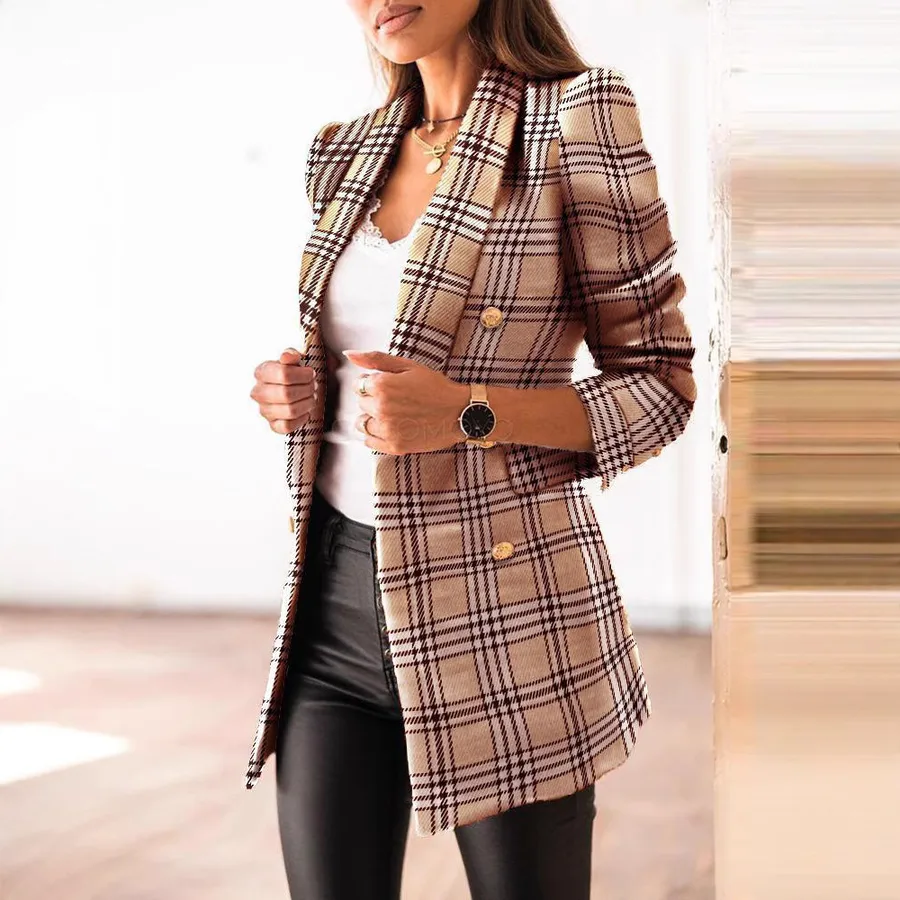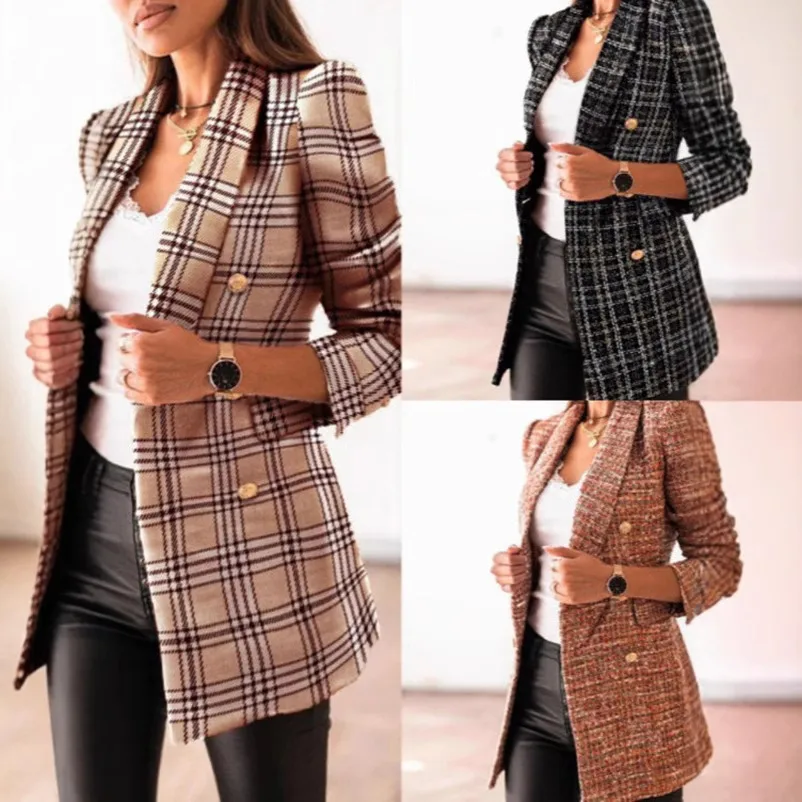 Elegant Long Sleeve Printed Blazer Women’s Fashion Autumn Winter Coat Double Breasted Suit Collar Slim Fit Commute Style