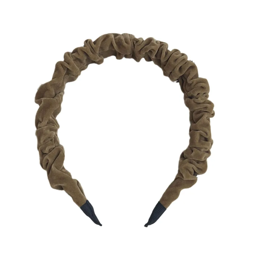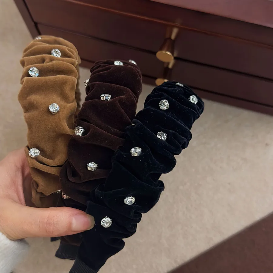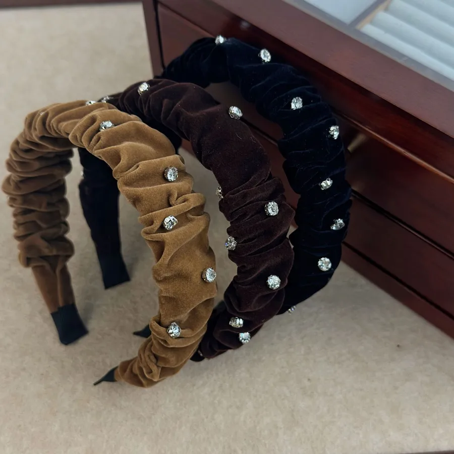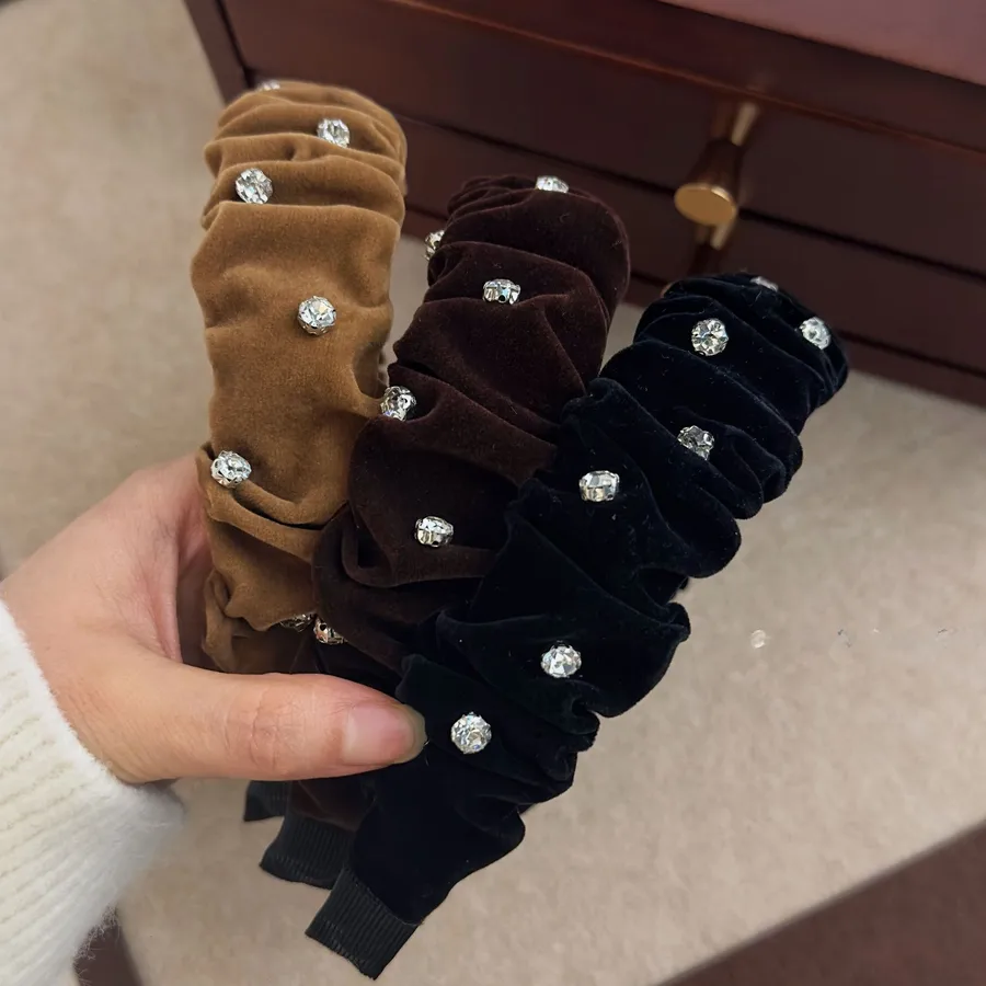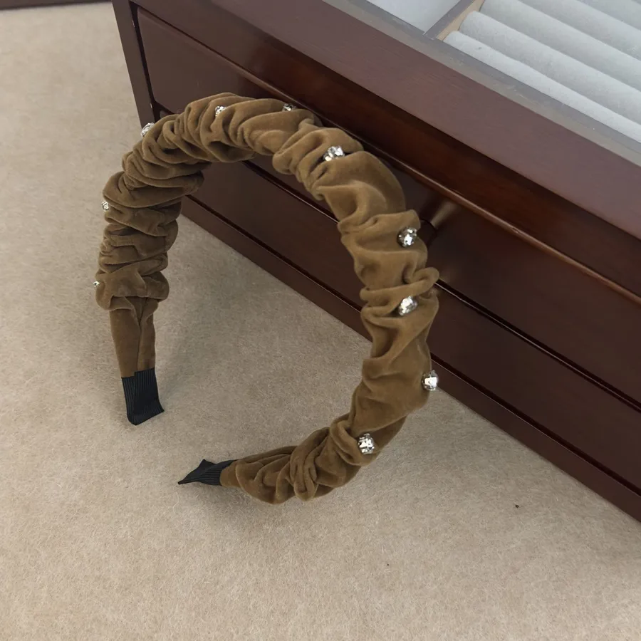 French Retro Heavy Embellished Velvet Pleated Rhinestone Headband Autumn Winter Brown Series Wide Face Wash Face Headband