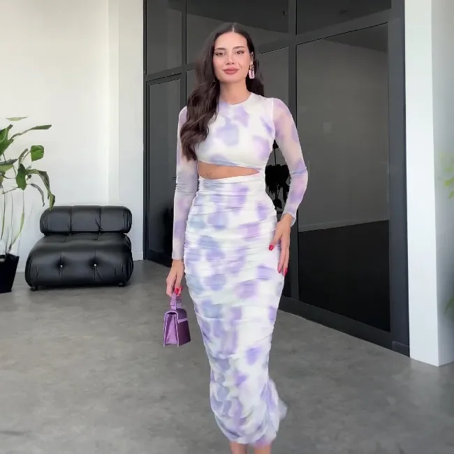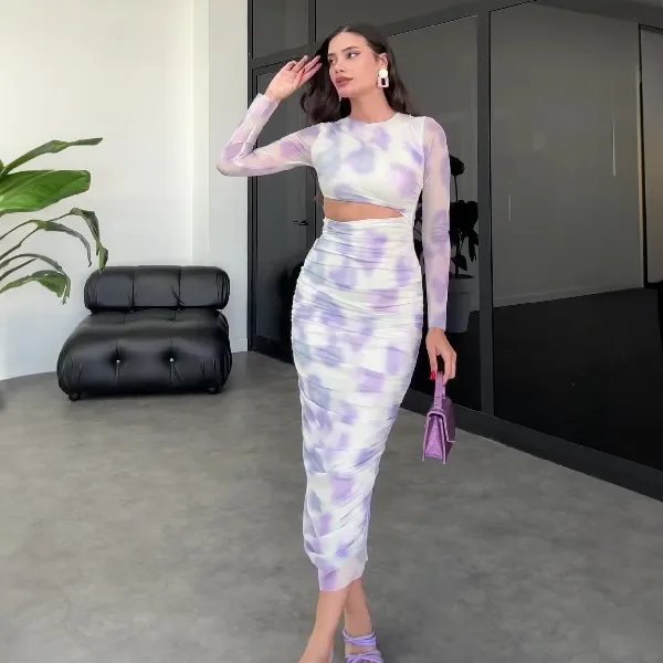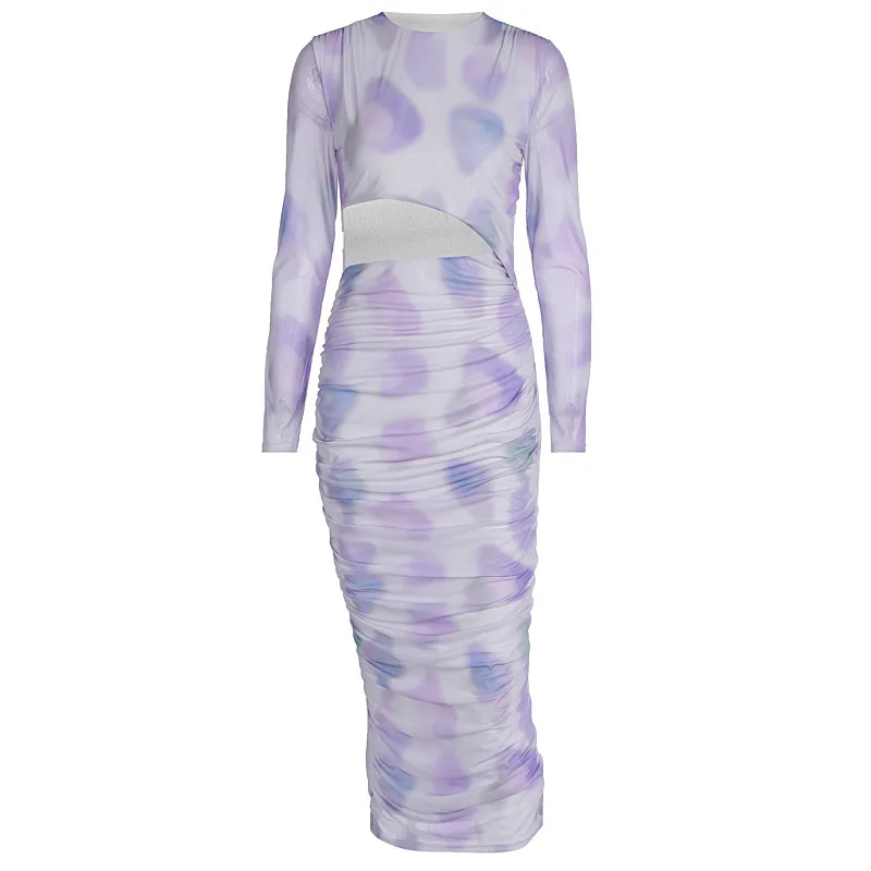 Gradient Color Printed Long Sleeve Women’s Dress Autumn Slim Long Dress Round Neck Pullover Dress