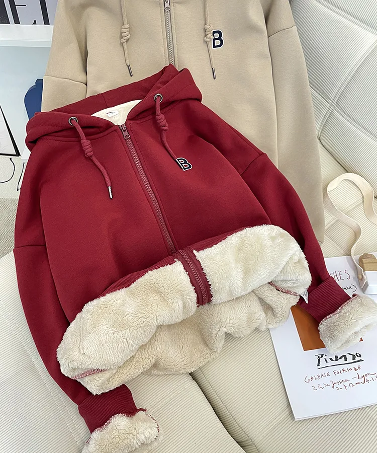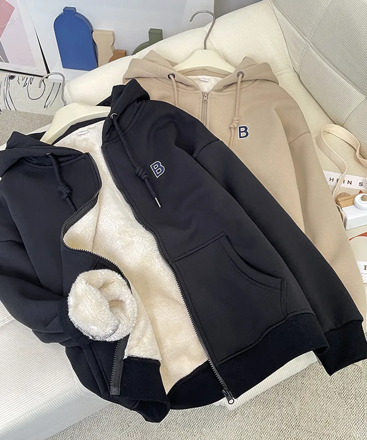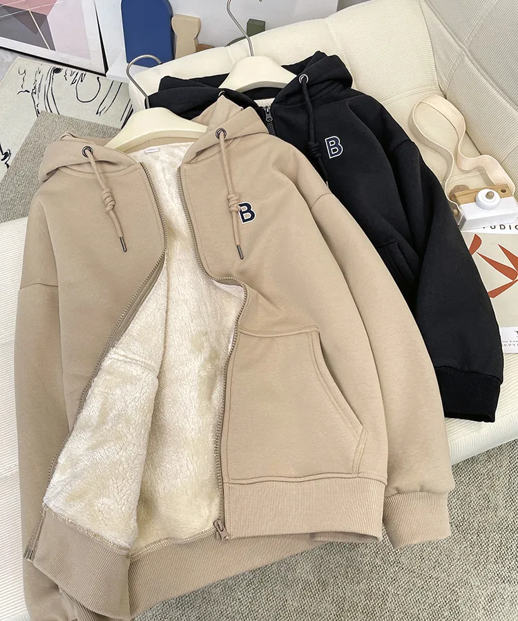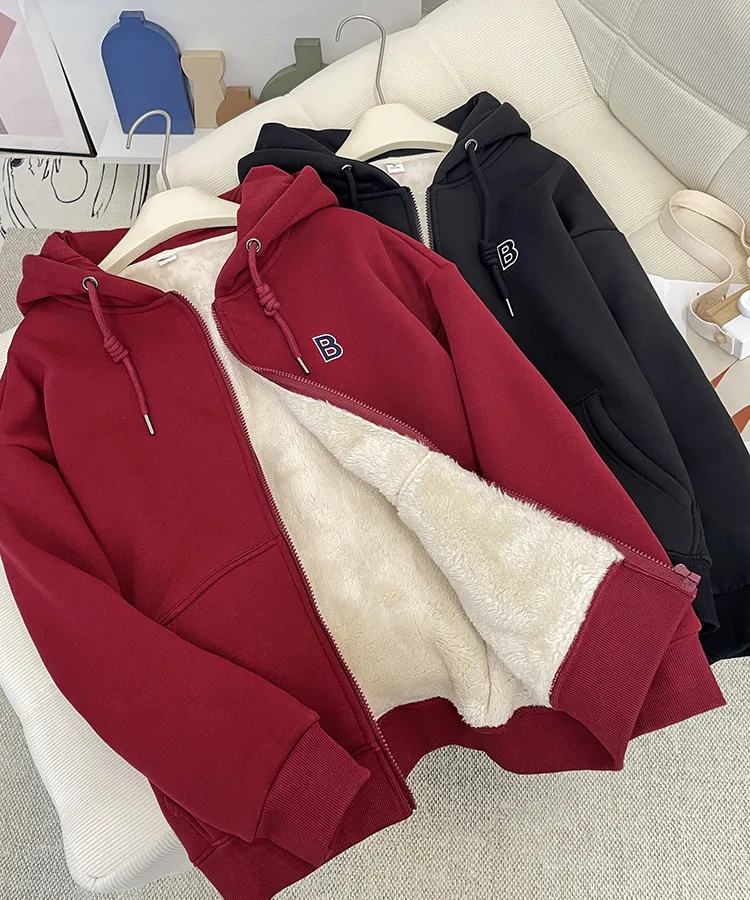 Lamb Fleece Lined Thickened Hooded Sweatshirt Women’s Autumn Winter Loose Warm Long Sleeve Zipper Coat Couple Style Outerwear