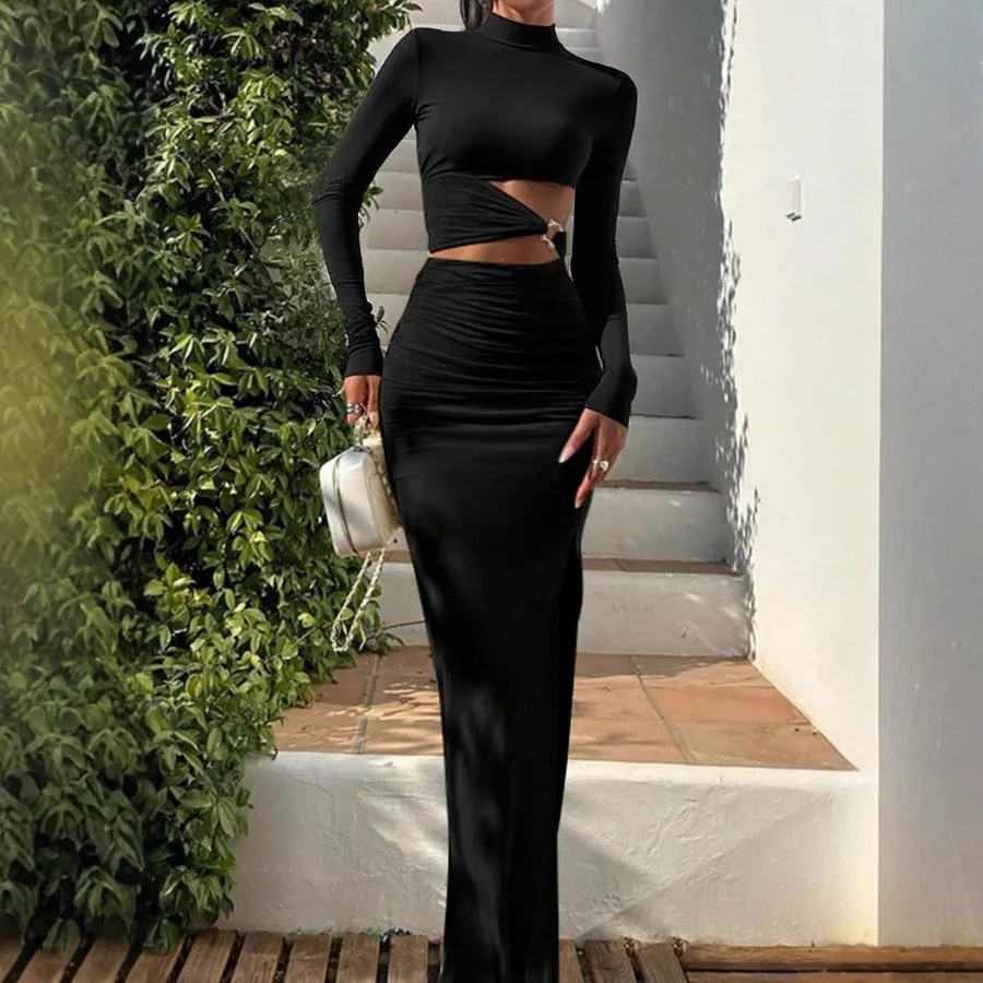 Long Sleeve Turtleneck Dress W473DS European Style Metal Buckle Decoration Solid Color High Waist Split Casual Polyester Dress
