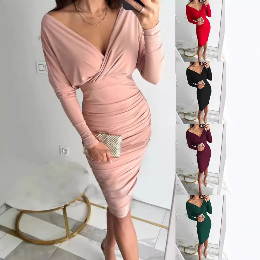 Long V-neck Sexy Bodycon Dress for Women, Autumn and Winter Slim Fit Long Dress, Polyester Spandex Casual Dress