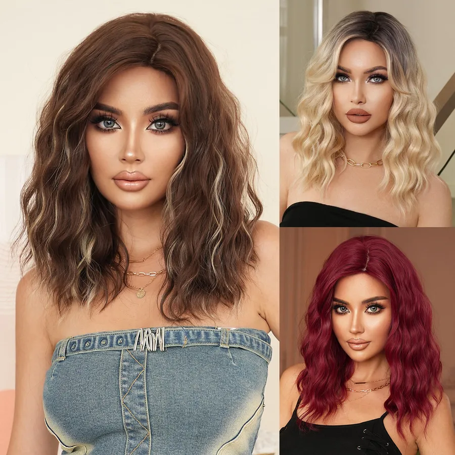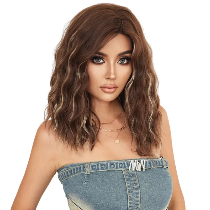 Natural Brown Ombre Wig Women’s Shoulder-Length Curl Hair Part Synthetic Heat Resistant Fiber Wig European Style Divided Bangs