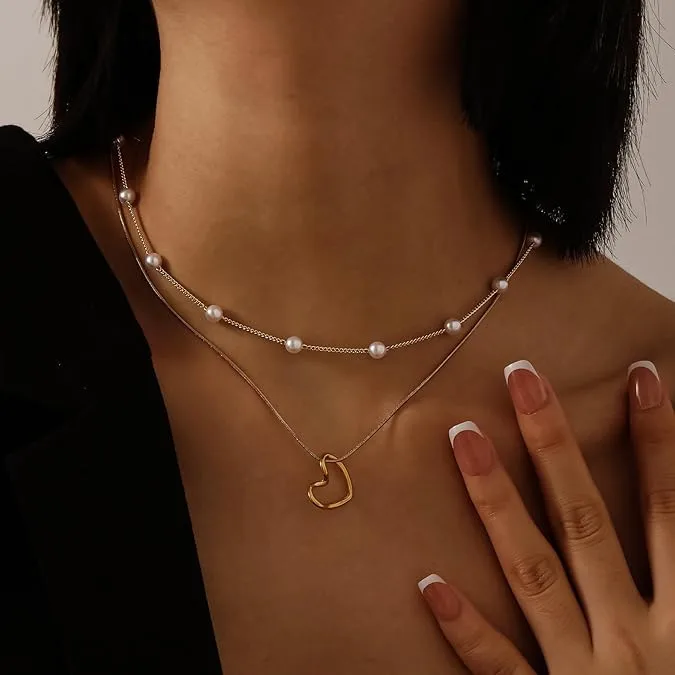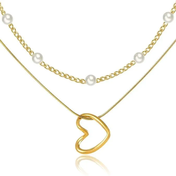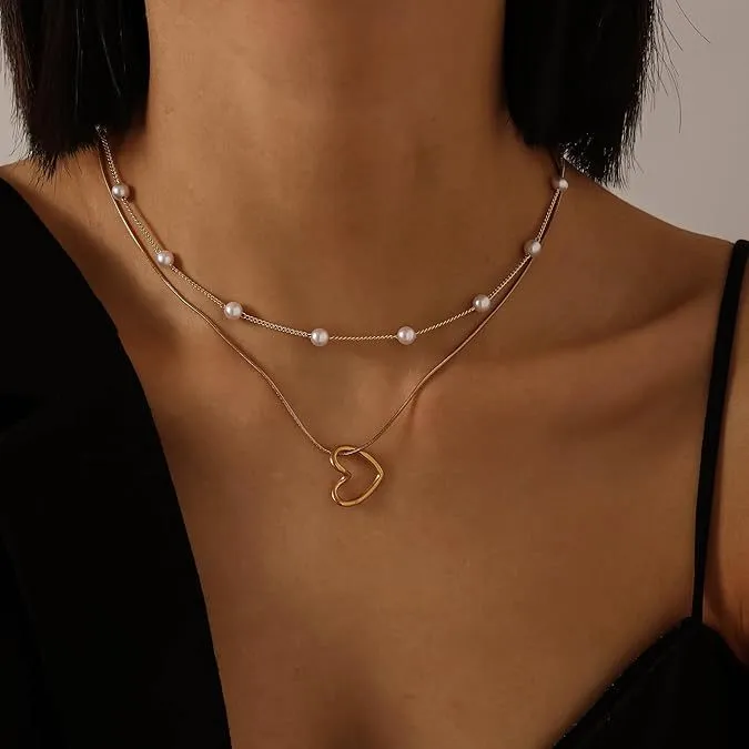 New Fashion Double Layered Necklace with Delicate Heart Shaped Pendant Imitation Pearl Luxury Cute Gift Women’s Jewelry Accessory