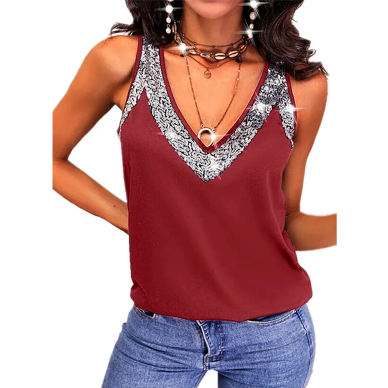 New Women’s Loose Fit Sleeveless V-Neck T-Shirt Pure Color Sequin Top Sexy Style Comfortable Polyester Blend Casual Wear