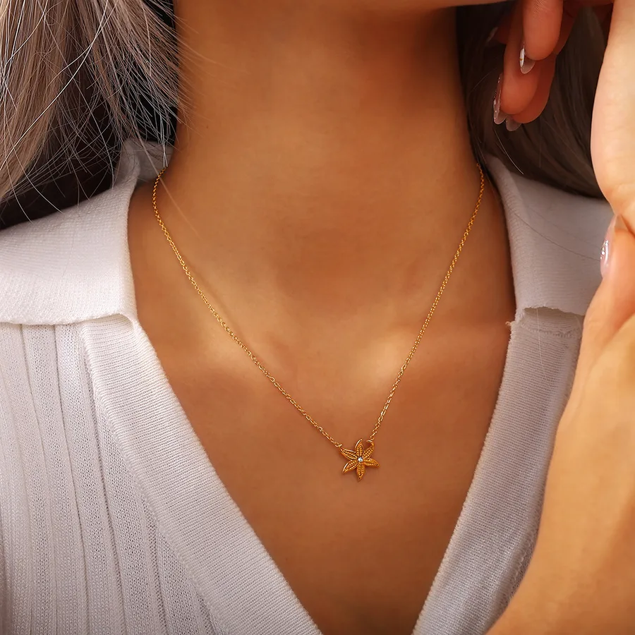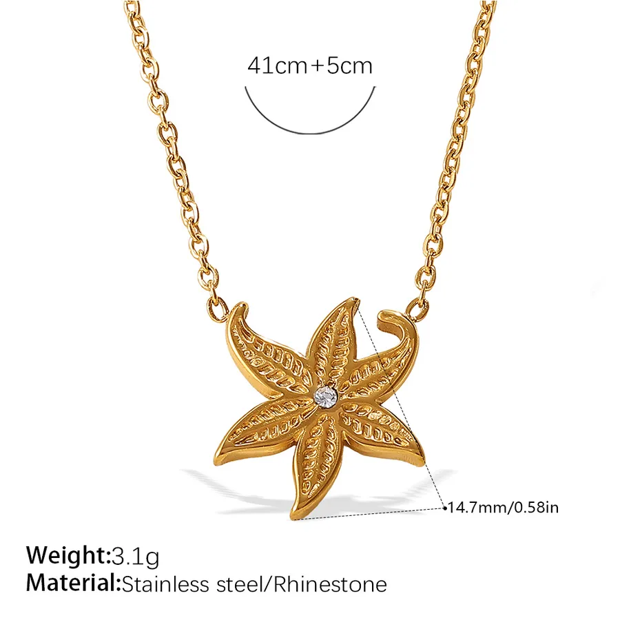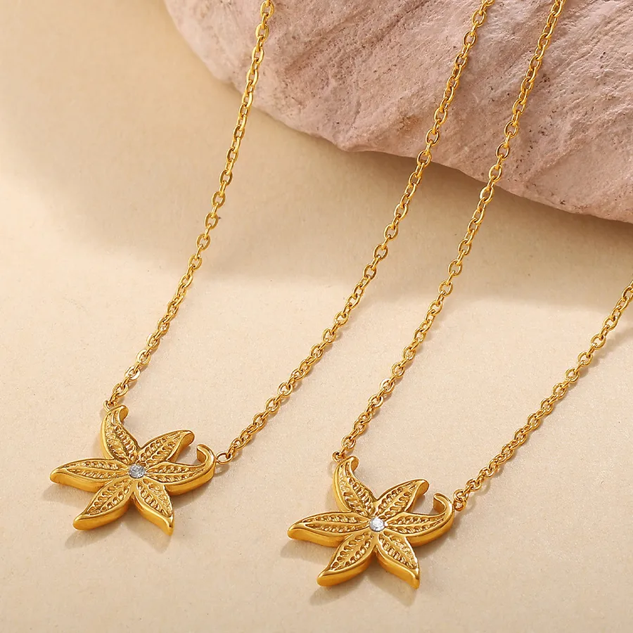 Ocean Style Starfish Inlaid Zircon 304 Stainless Steel 18K Gold Plated Vacuum Electroplating (Fired) Waterproof Non-Fading Cable Chain Necklace for Women