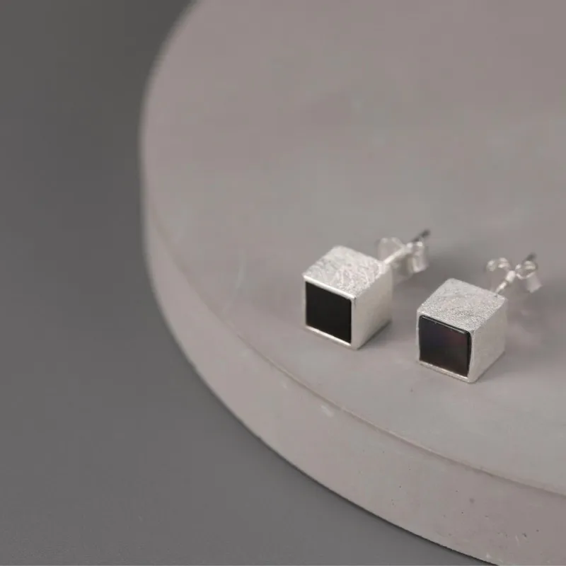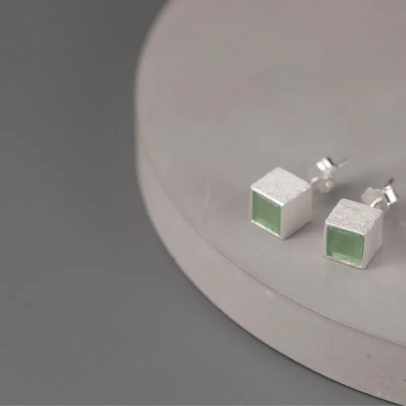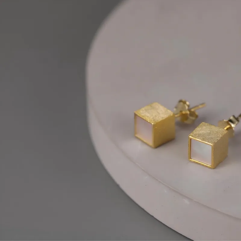S925 Sterling Silver Natural Dongling Jade 18K Gold Plated Seawater Mother-of-Pearl Minimalist Geometric Cube Earrings