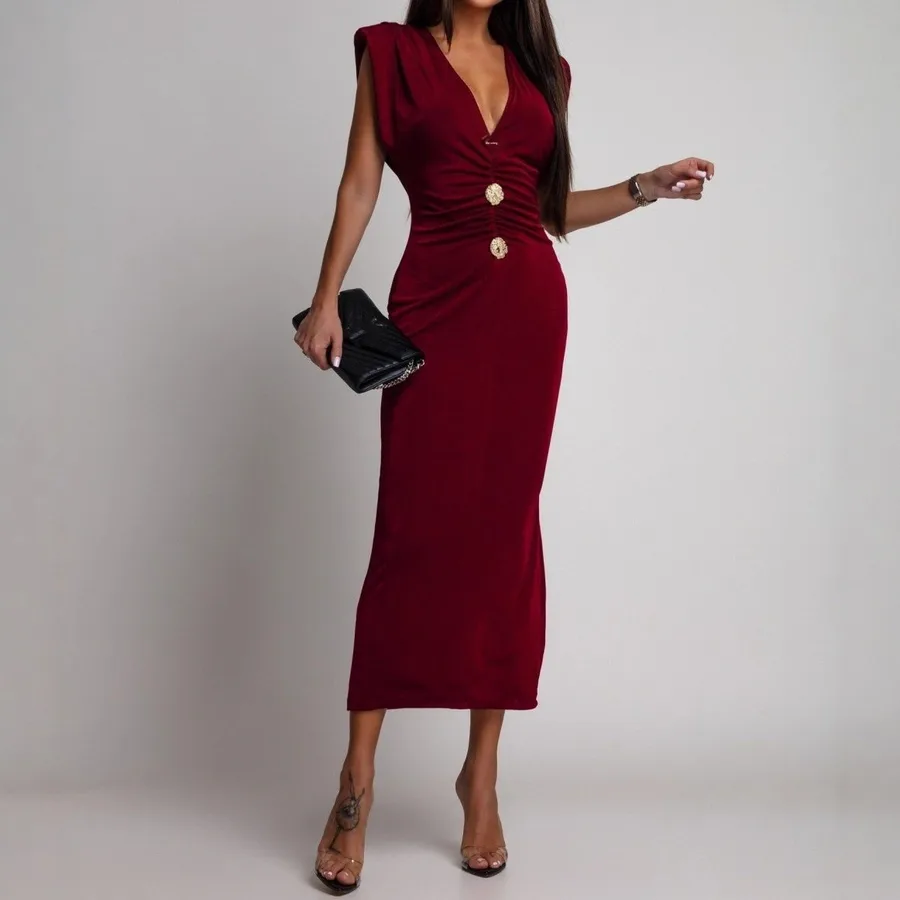 Sexy Deep V Neck Button Slim Fit High Waist Sleeveless Solid Color Long Dress Style W450DS