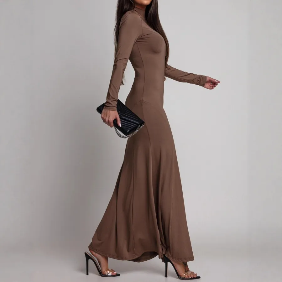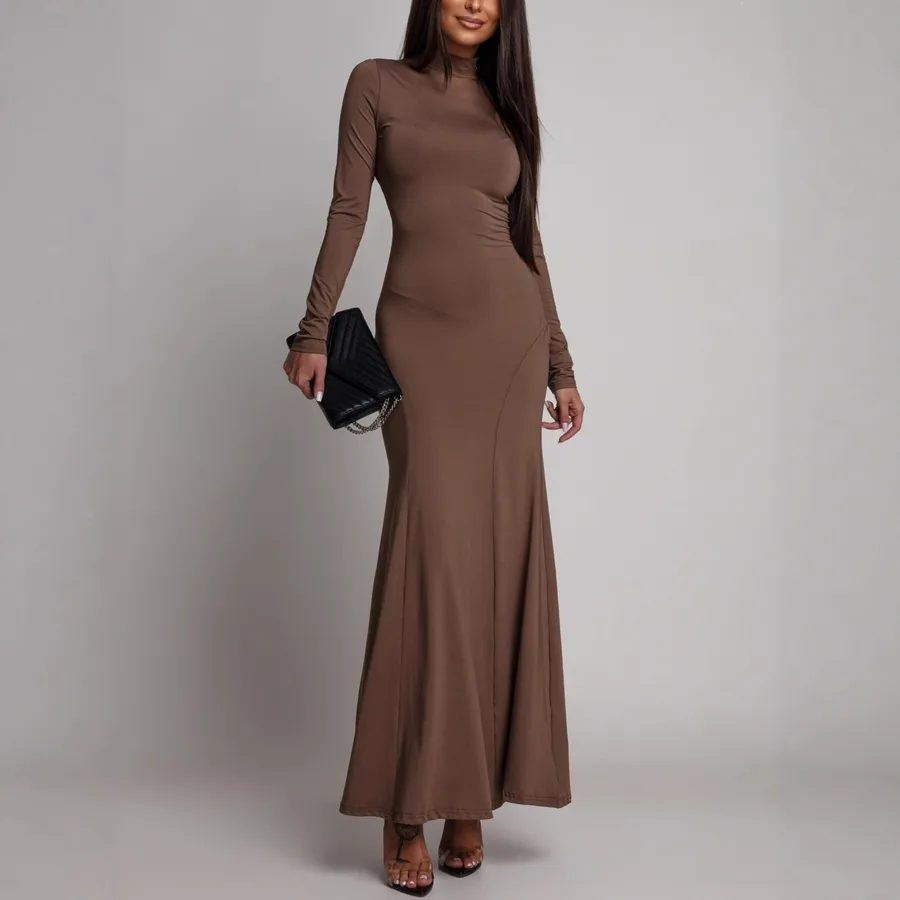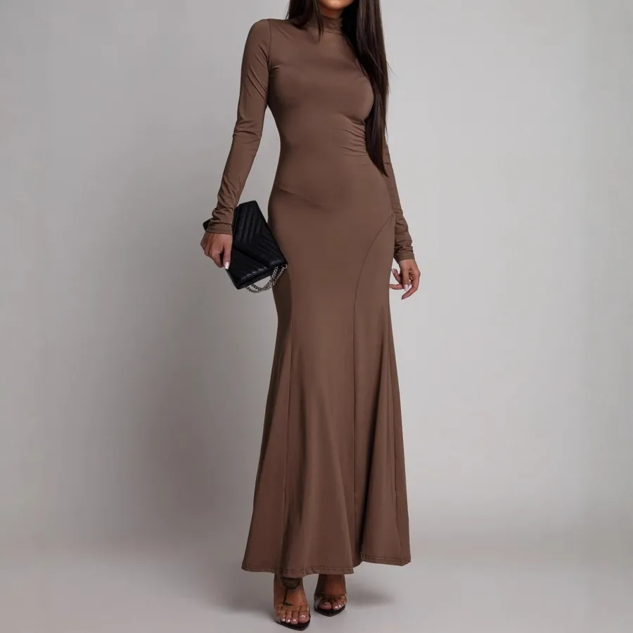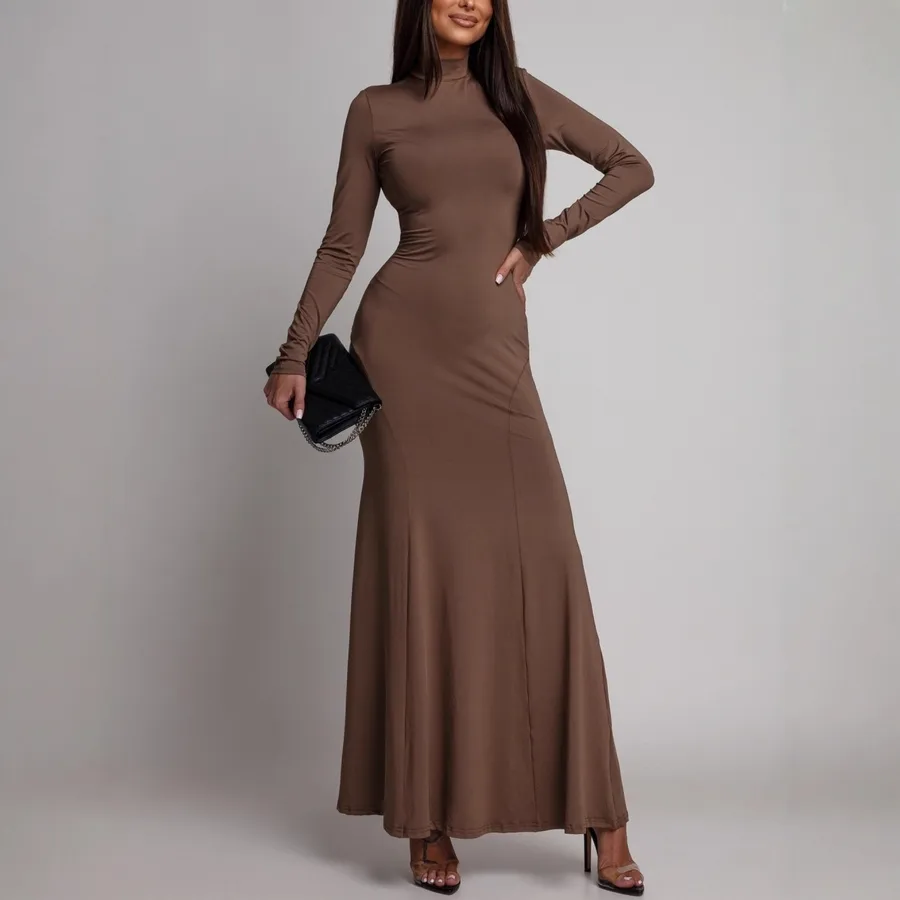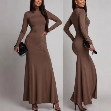 Slim High Waist Long Dress W447DS Autumn Winter Women’s Solid Color Long Sleeve Half High Collar Dress