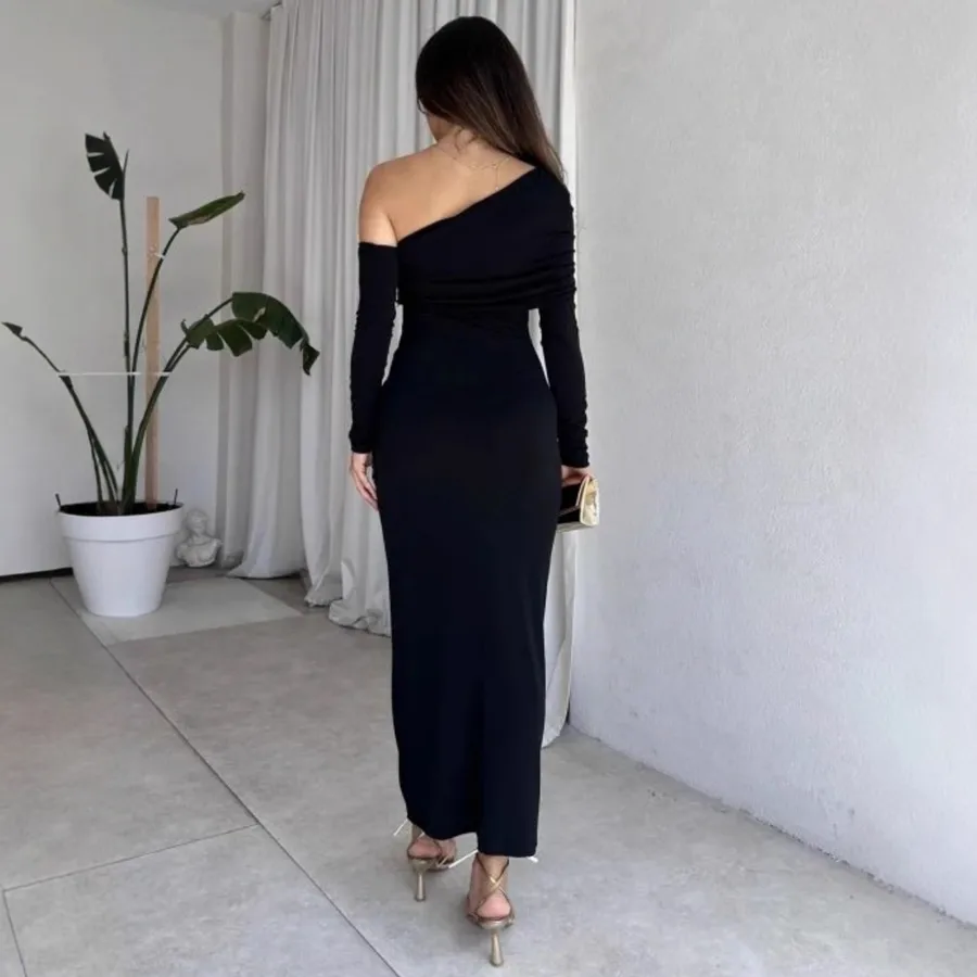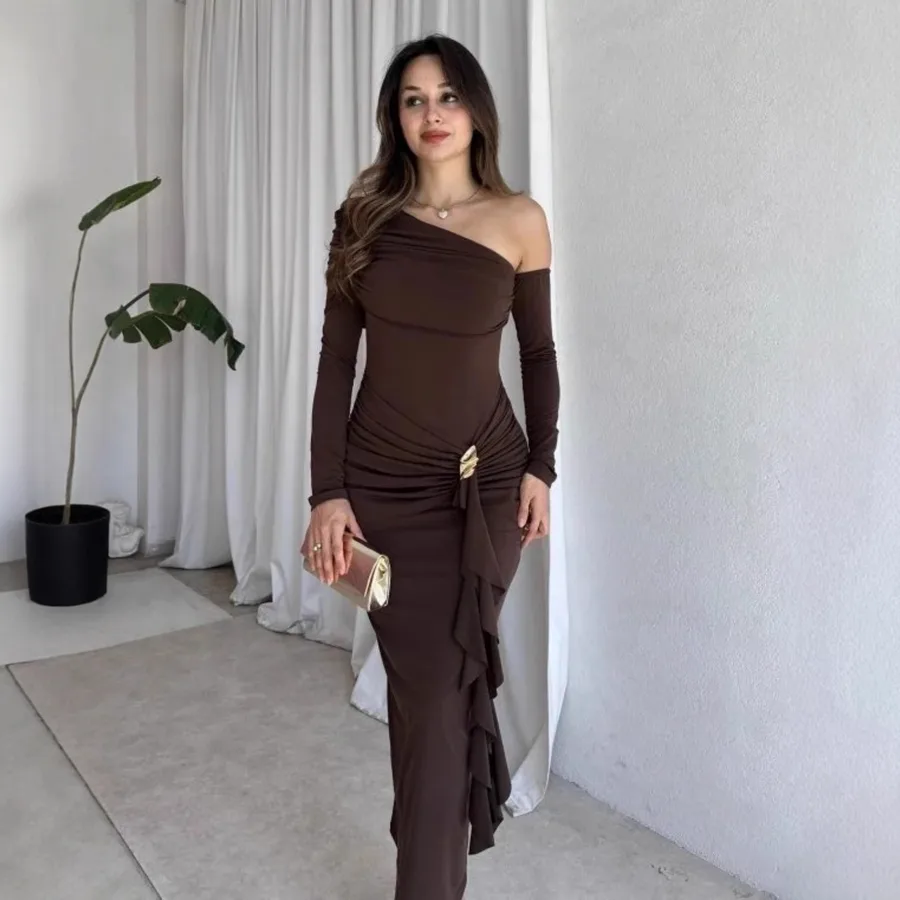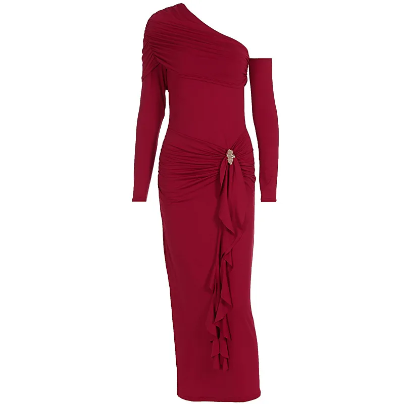 Solid Color Long Sleeve Wrap Dress Sexy Business Evening Gown Ruched One Shoulder Design Suitable for Autumn