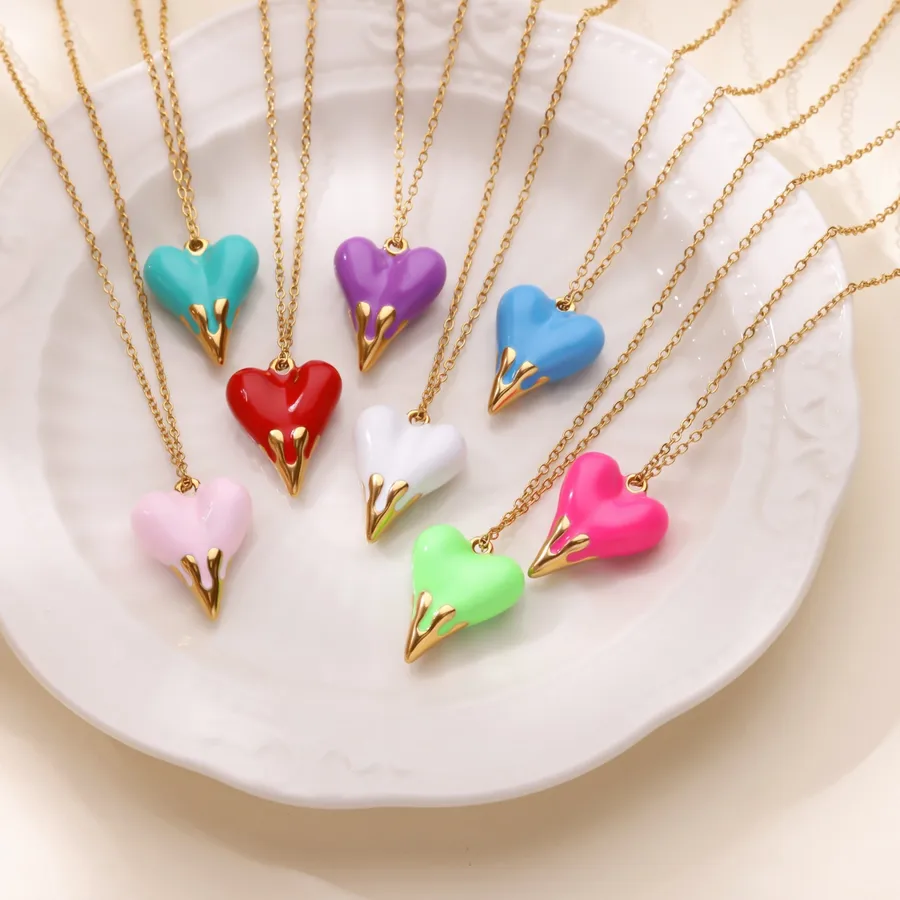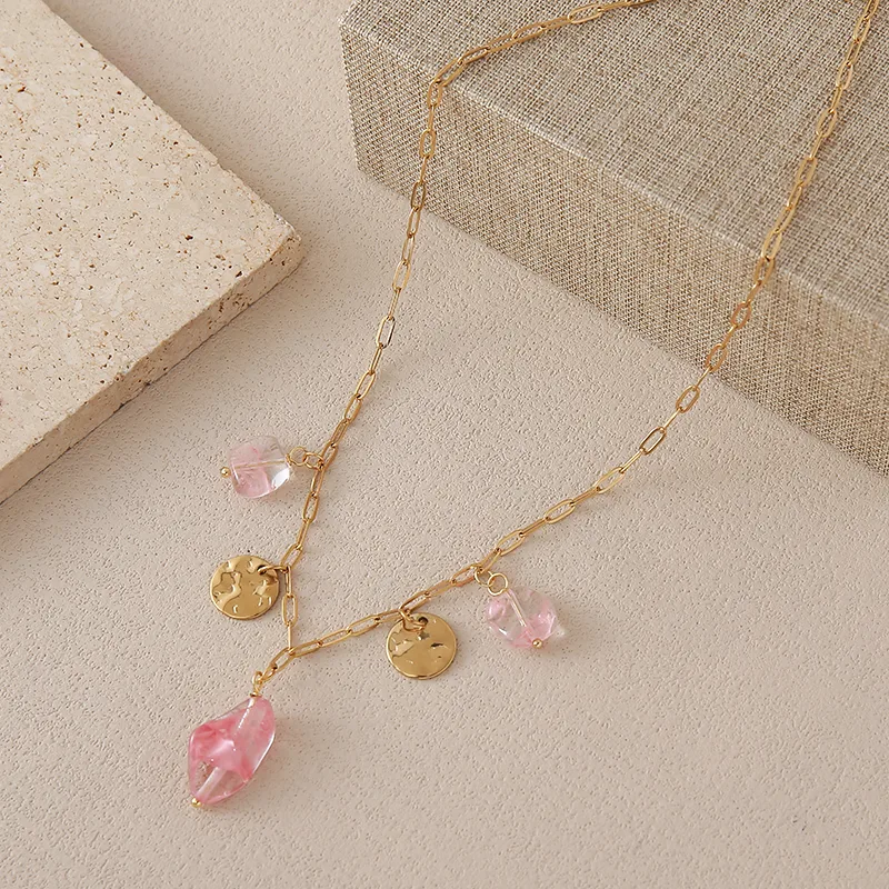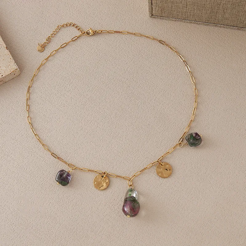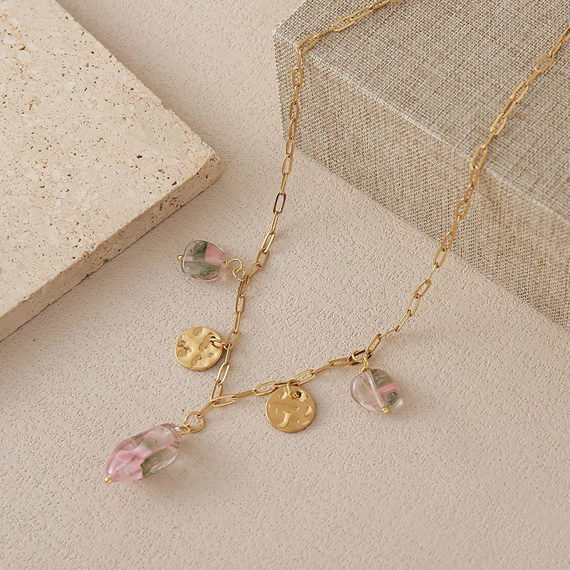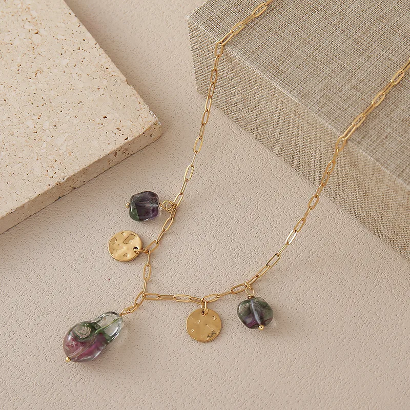 Trend 304 Stainless Steel Loop Chain 18K Electroplated Gold Wrinkled Glass Pendant Necklace Handmade Tassel Round Beads Anti-Allergy Lobster Clasp