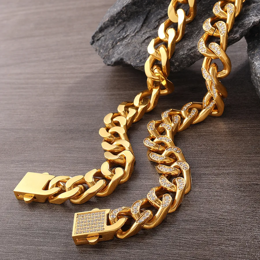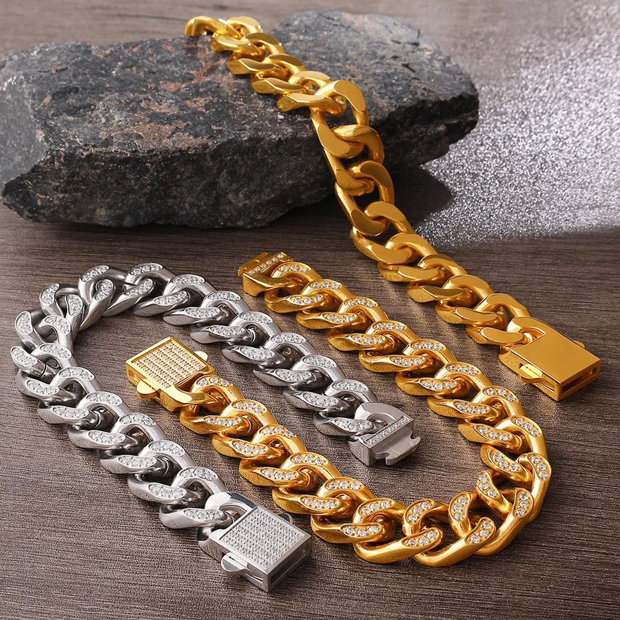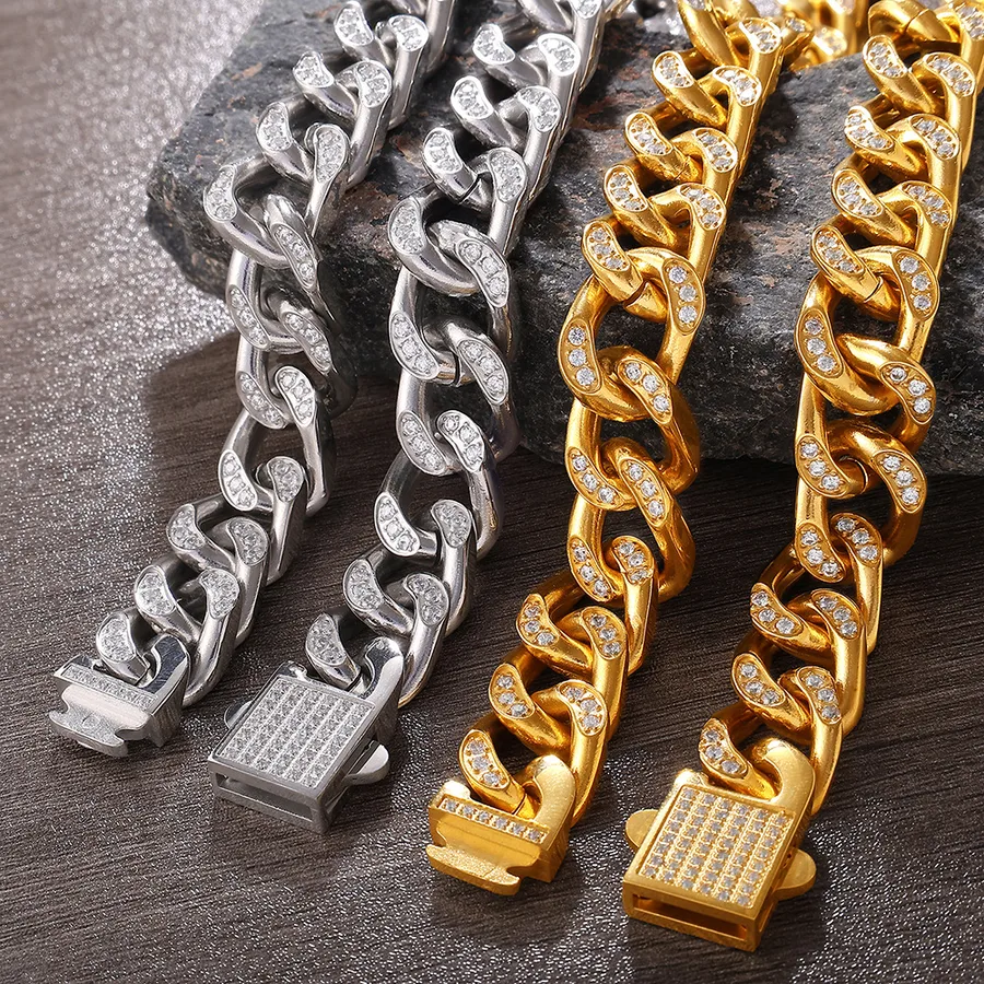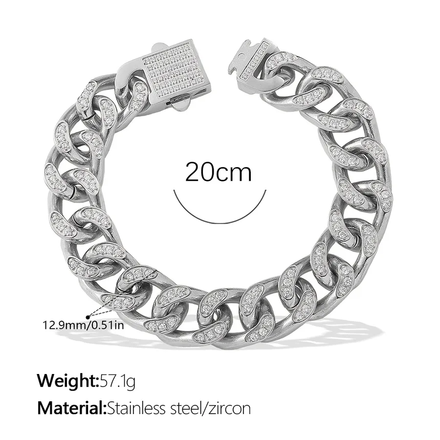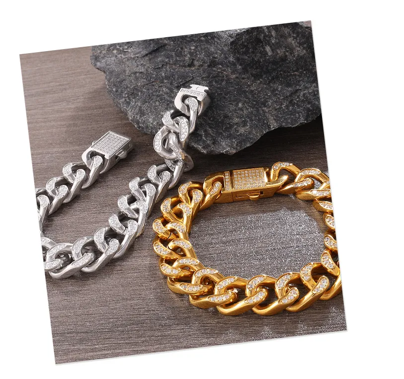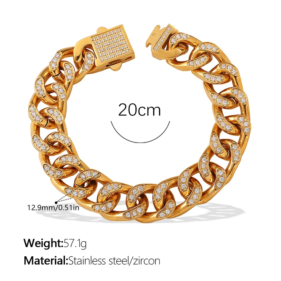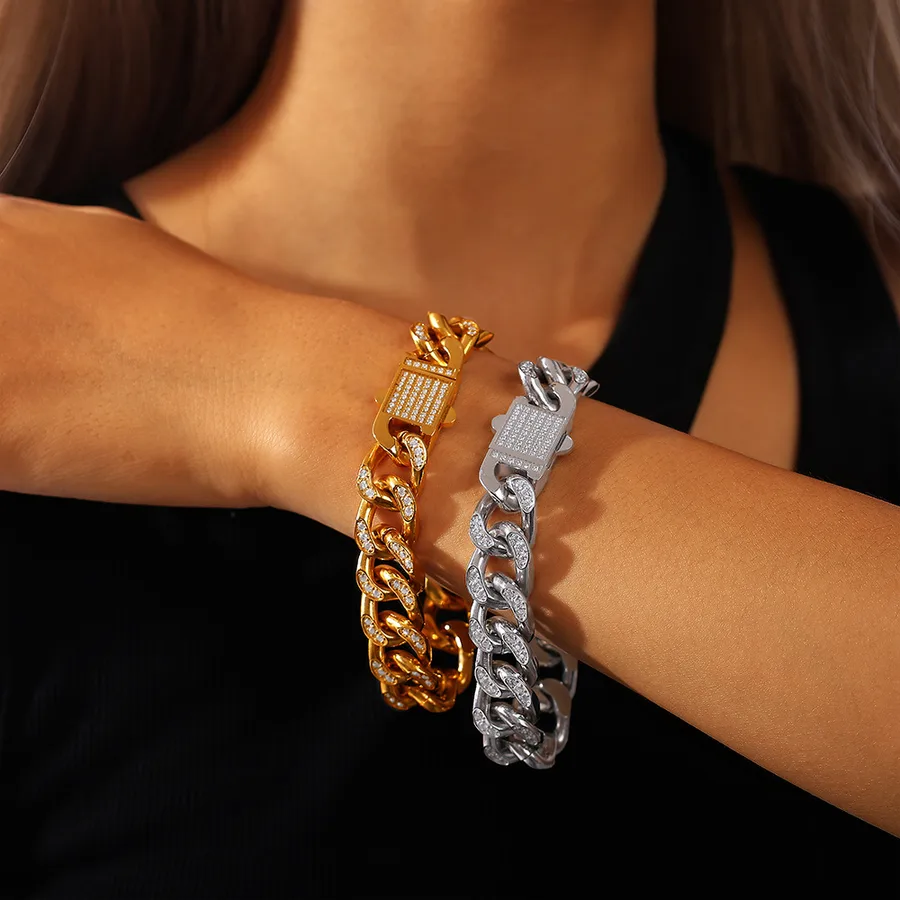 Trendy Faceted Diamond-Encrusted Chain Cuban Hip-Hop 304 Stainless Steel 18K Gold Plated Bracelet Vacuum Electroplated Zircon Geometric Waterproof Non-Fading