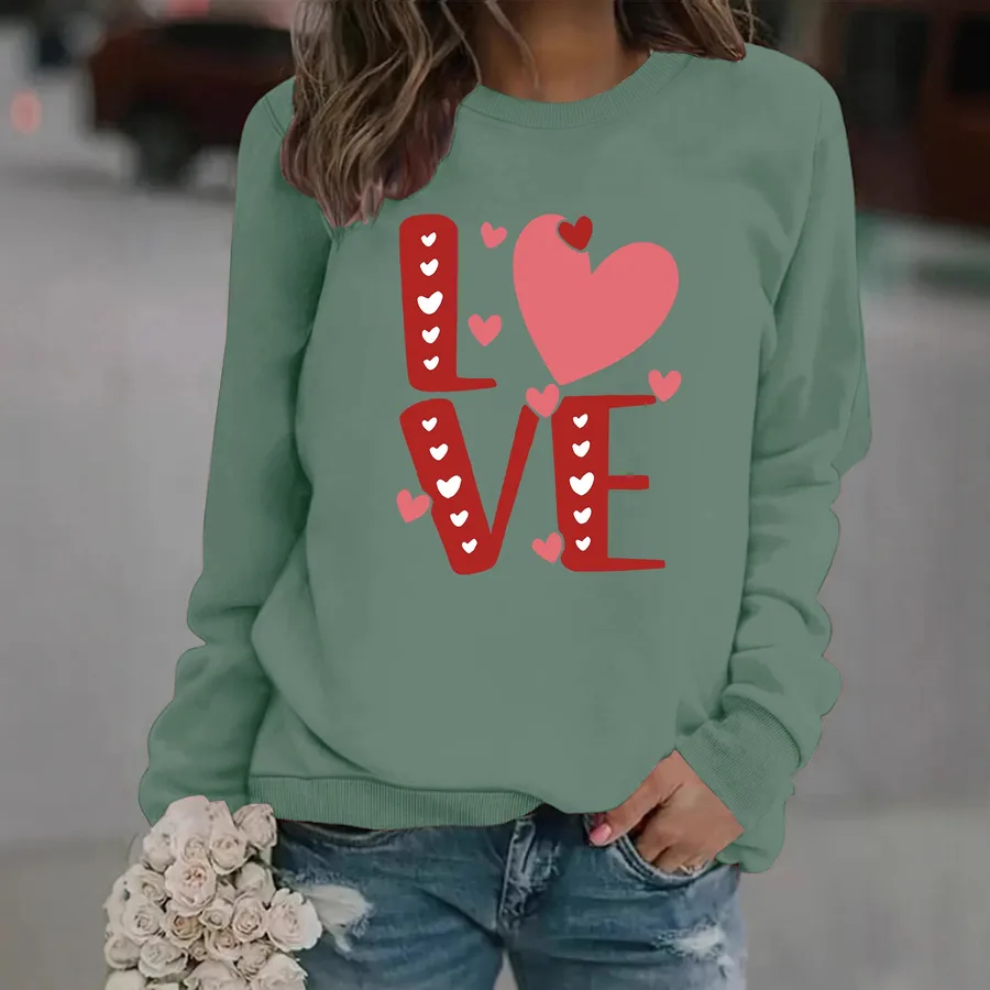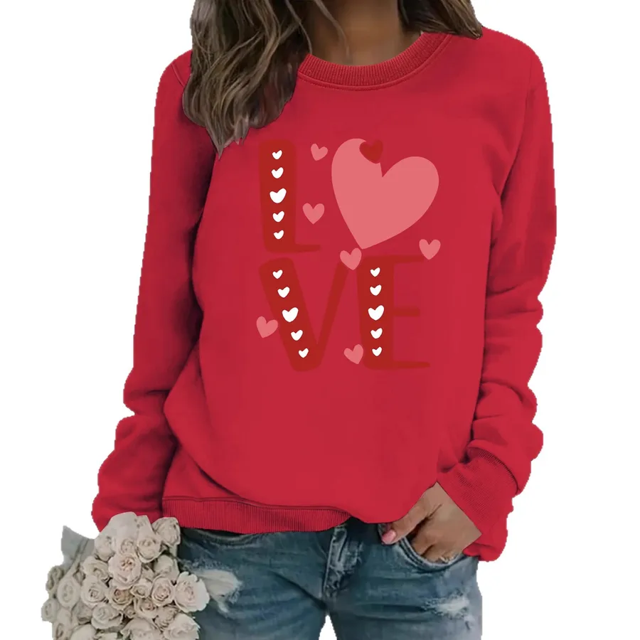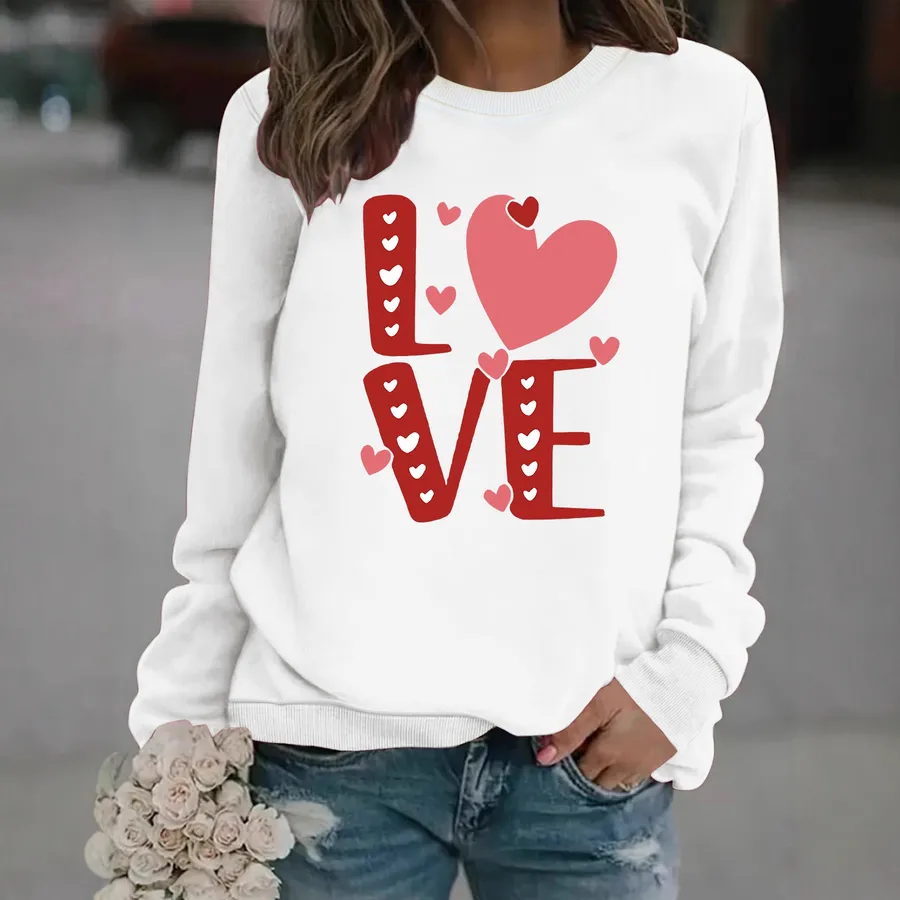 Valentine’s Day Heart Print Long Sleeve Hoodie Women’s Base Layer Polyester Spandex Material Regular Fit Round Neck